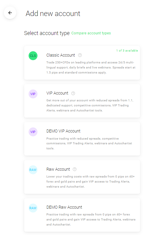 You may open additional trading accounts via your dashboard by clicking on ‘Add new account’ as on the picture below: