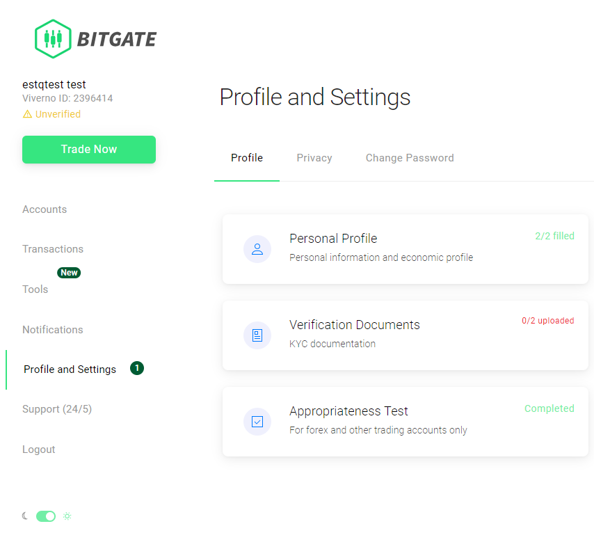 After you have opened an account with Bitgate, you are asked to complete personal details (date of birth, residential address details, etc.) as soon as possible. This should help you speed up the verification process.